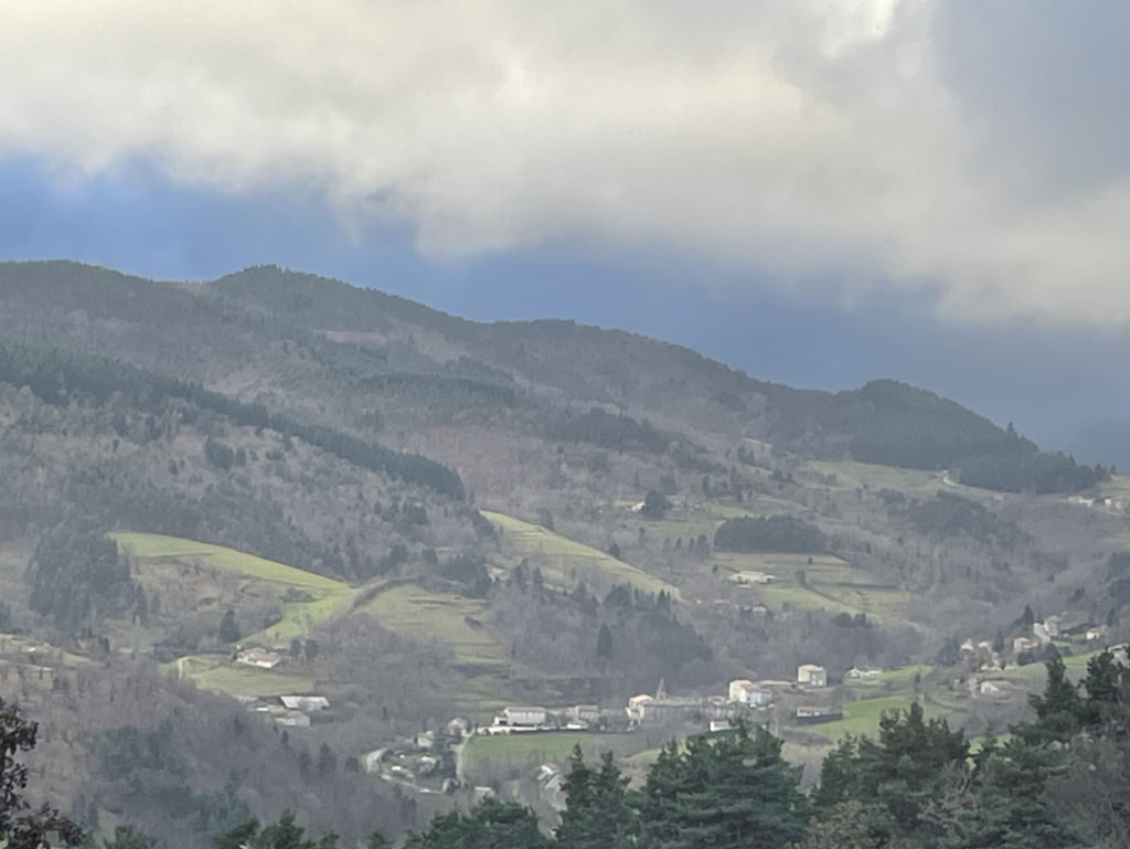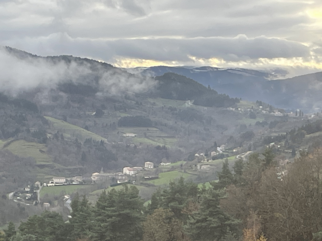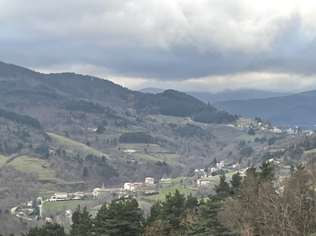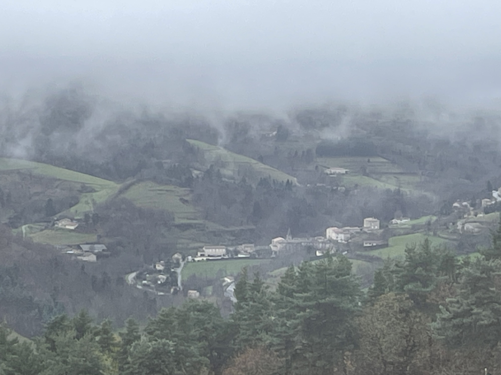 Un aperçu du village depuis le sommet d’Escoussenas, enveloppé par un ciel gris et une lumière d’automne.