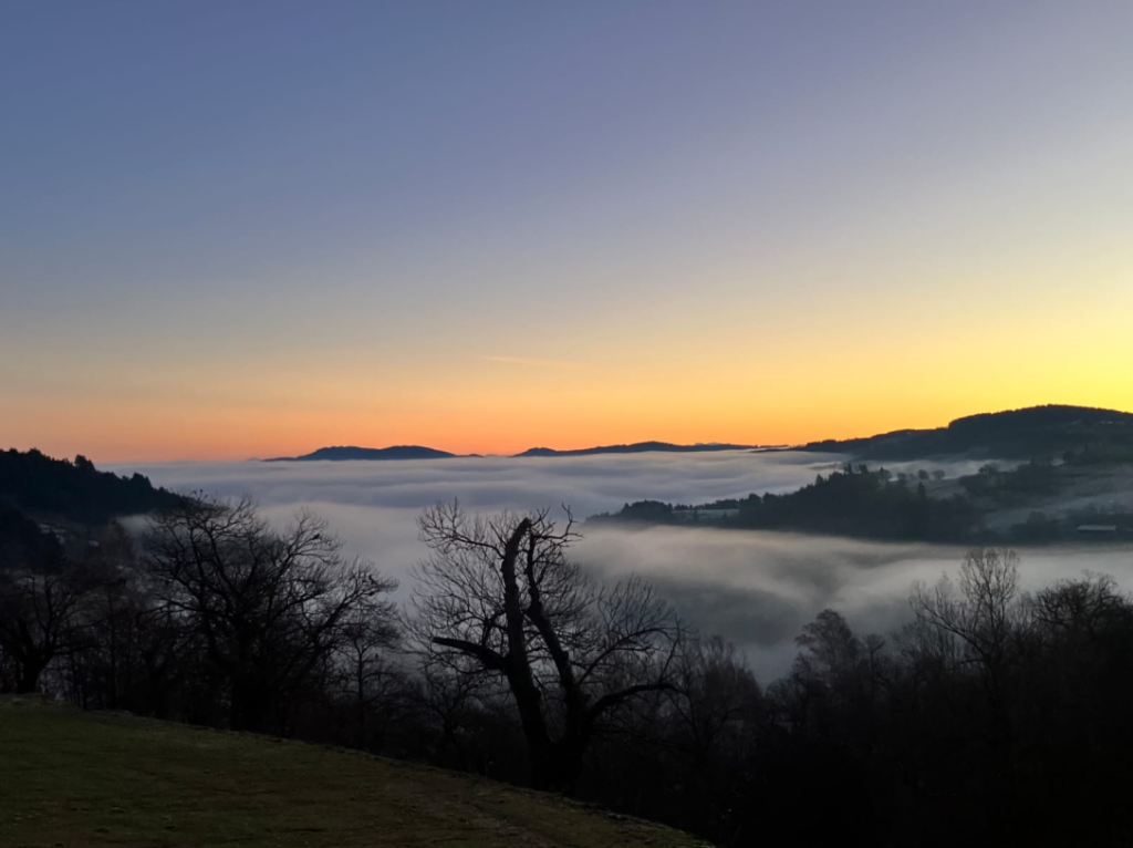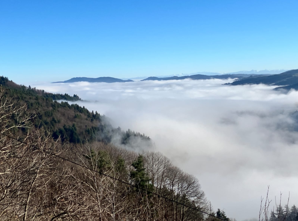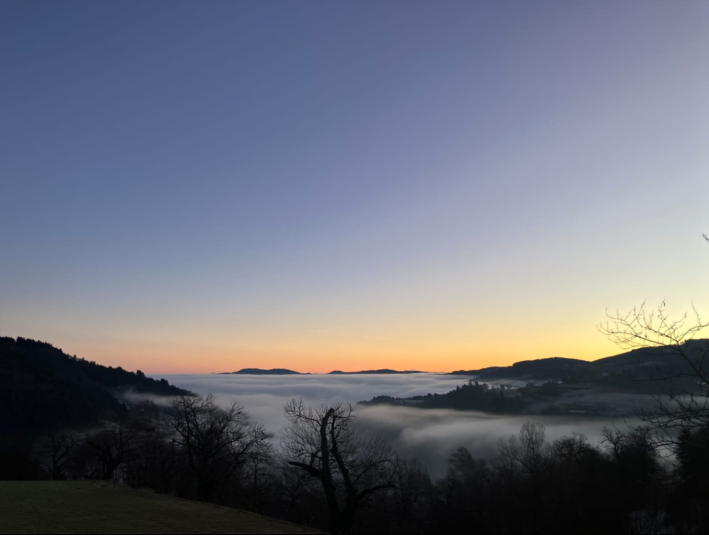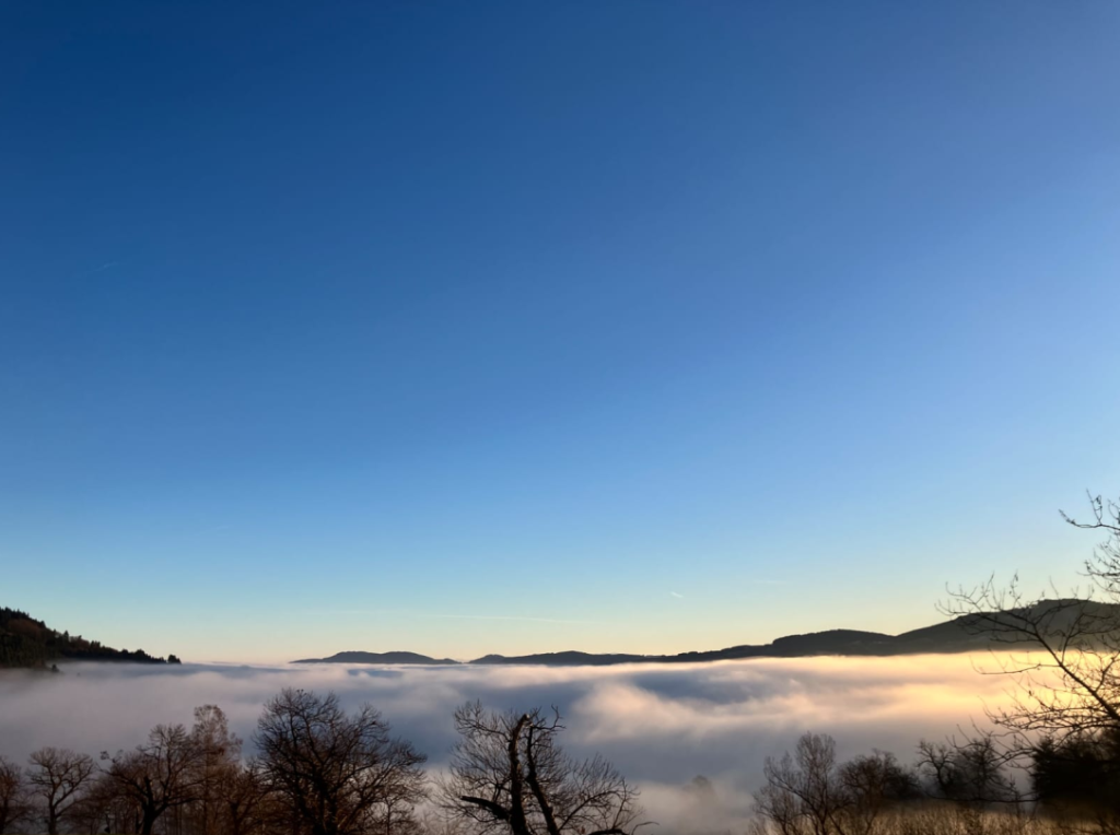 Un aperçu du village depuis le sommet d’Escoussenas, enveloppé par un ciel gris et une lumière d’automne.